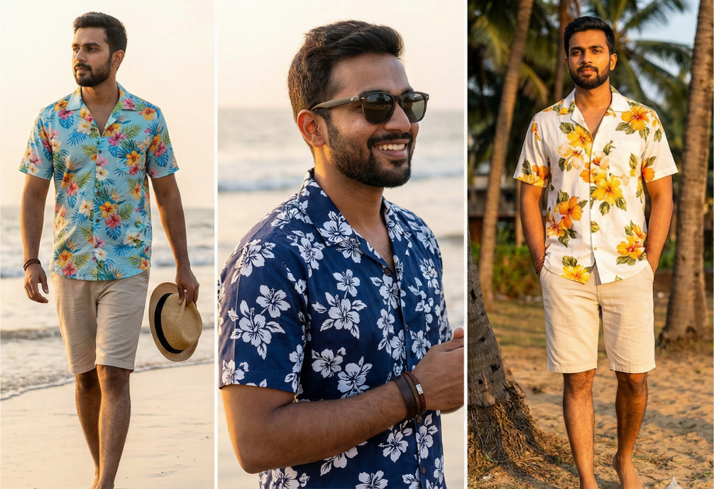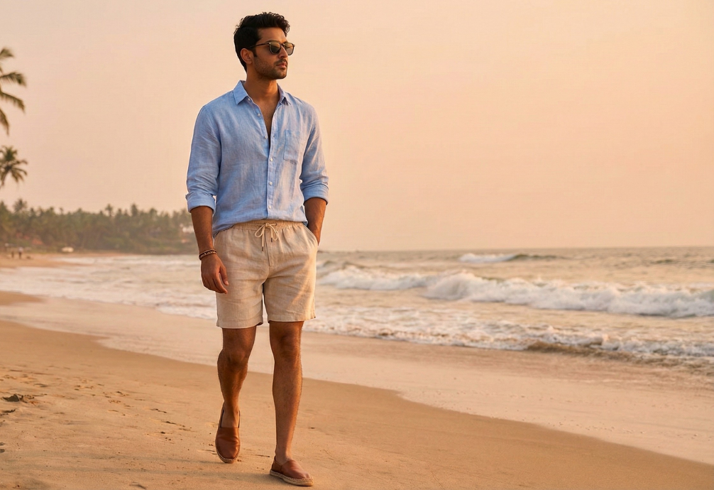 A white or pastel linen shirt goes perfectly with beige trousers or navy shorts. Leave the top buttons open for a relaxed look, and make your Goa outfits for mens stand apart.