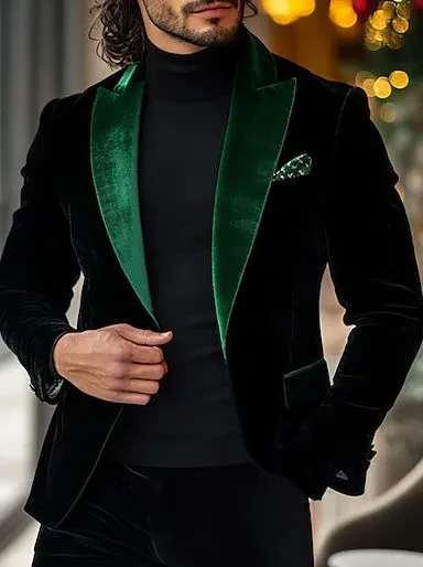 A velvet dinner jacket in jewel tones like emerald green or burgundy adds a festive touch while maintaining formality.